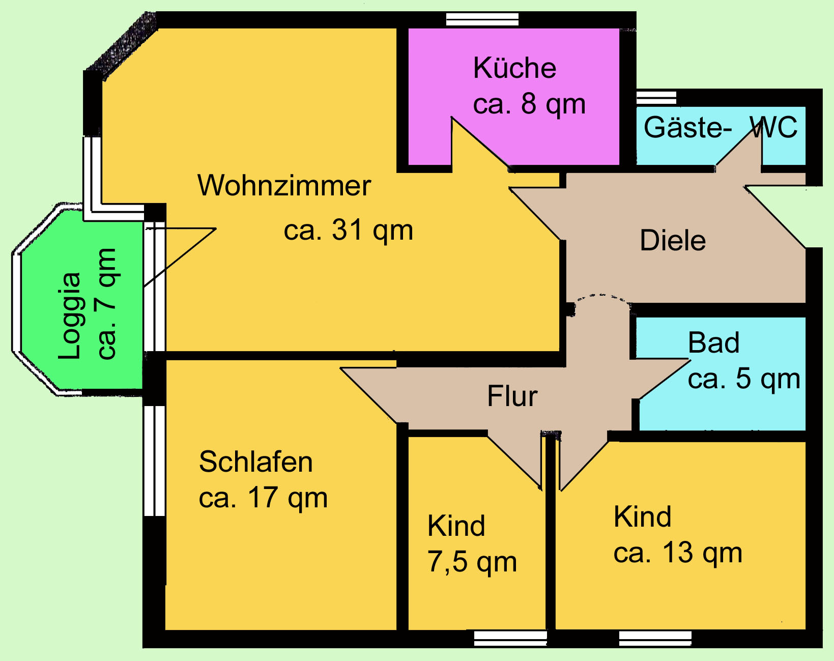 Alle Zimmer sind mit neuwertigem hellem Holzparkett, braunen Holztüren und dunkelbraunen Holzfenstern ausgestattet. Energiesparende und umweltfreundliche Gaszentralheizung ist ebenso Bestandteil der Wohnung wie auch ein Kellerabteil und ein Waschmaschinen-Münzraum. Ein grosszügiges Wohnzimmer (30,5 m²) mit Westbalkon und Essplatz befinden sich neben der Küche. Das Schlafzimmer und die beiden Kinderzimmer sind jeweils mit Südfenster ausgestattet. Die Küche (ca. 8 m²) mit Nordfenster und weisser Küchenausstattung befindet sich unmittelbar neben dem Essplatz. Das Bad ist hell gefliest und weissen sanitären Einrichtungen: 2 Waschbecken, WC, Badewanne, Waschmaschinen-anschluss. Weisser beleuchteter Spiegelschrank über den Waschbecken. Gäste-WC mit Waschbecken und Fenster. Grosszügige Diele (8 m²) mit Fliessenboden und einem grossen weissen Einbauschrank. Ein ca. 40 qm großer Sauna- und Fitnessyraum ist im Keller und für die Mieter allgemein zugänglich. Die Saunazeiten können einzeln belegt werden. Ein Garten zur Allgemeinbenutzung mit Kinderspielplatz und Grillplatz ist ebenfalls vorhanden.